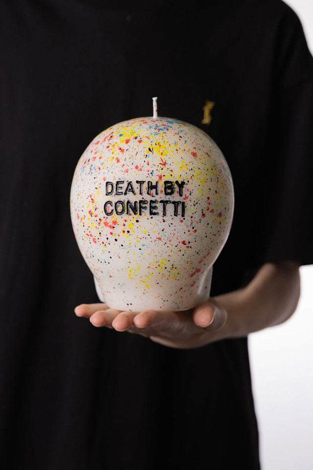 骸骨はサイケデリックな紙吹雪で覆われ、背面には『Death By Confetti』と刻まれています。