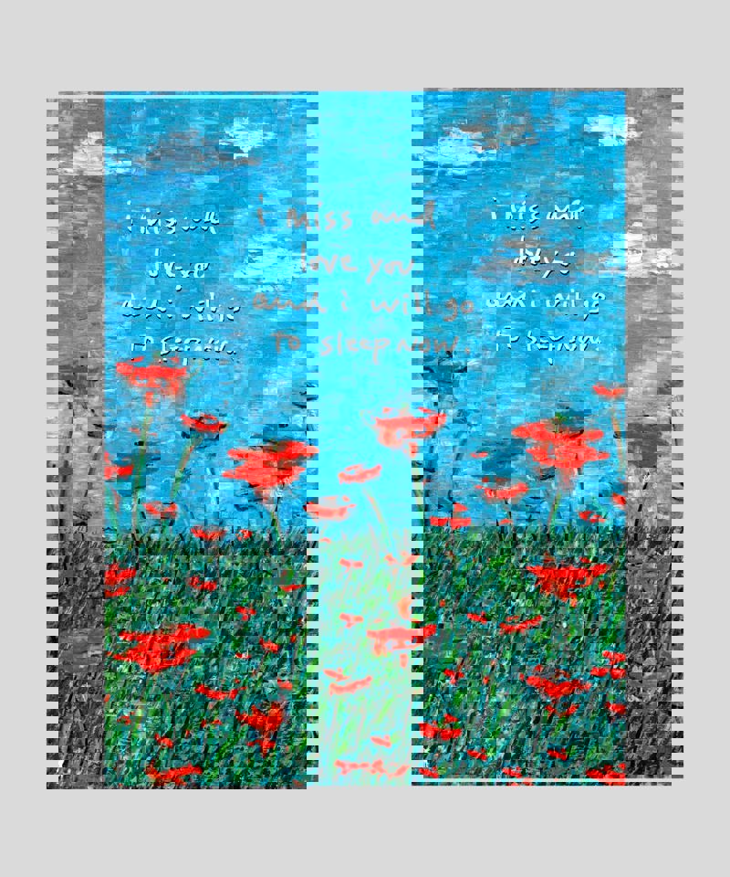 このポスターは、ジョニーの愛犬であったムーが陽の光の中で戯れる様子が描かれた、荘厳なポピー畑での思いを込めたものです。その風景を前に捉え、「I miss and love you and I will sleep now」という言葉で夢見心地な風景を浮かび上がらせています。最も愛された魂への愛情あふれるトリビュートです。