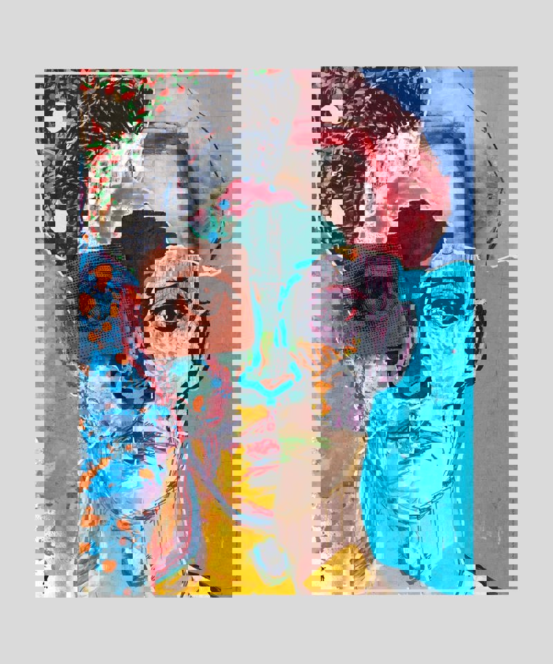 「ザ・メニー・フェイセス」ポスターは、ジョニーがキャリアを通じて描き続けてきた多作なキャラクターたちへ、ポストモダンな解釈を加えた作品です。顔のパーツを切り貼りしたようなコラージュは、荒々しい切り抜きのように構成され、ジョニーの芸術的技法の数々を展示しています。彼の特徴的な荒い筆跡、インパスト技法による重ね塗り、衝動的なスプラッシュなどが含まれます。鮮烈で印象的なこの肖像は、芸術家の捉えどころのない肖像画のへのオマージュです。