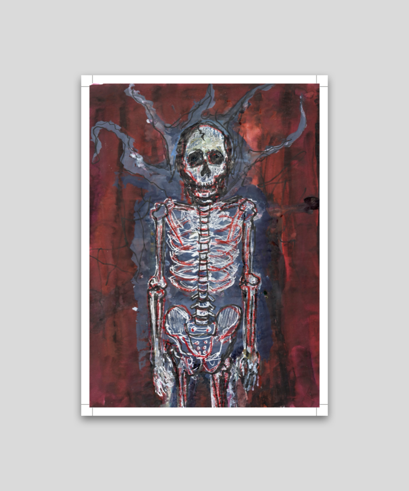 ジョニー・デップのダークな骸骨をテーマにした作品の一つで、エネルギッシュなスクラッチ調の線が不気味な主題に鮮やかさを与えています。制作年不明のジョニー・デップの作品を基にしています。