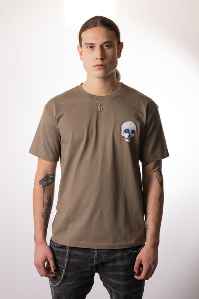 この緑の骸骨のデザインTシャツは、印象的なスケルトンが背面にプリントされています。ジョニー・デップの死と闇への強い関心がこのデザインに表れており、彼の家や写真に度々登場する頭蓋骨や骸骨を反映しています。